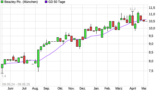 Mit dem Rücksetzer auf 10,30 EUR hat die Beazley-Aktie am 08.05.2025 die 50-Tage-Linie nach unten gekreuzt.