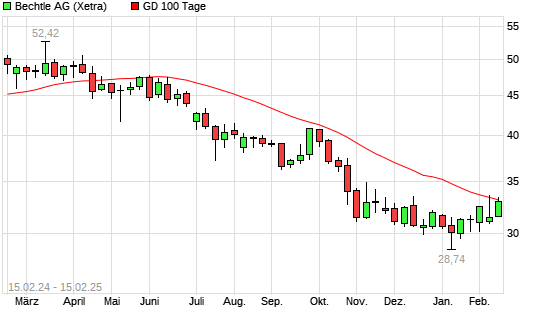Mit dem Anstieg auf 33,02 EUR hat die Bechtle-Aktie am 14.02.2025 die 100-Tage-Linie nach oben gekreuzt.