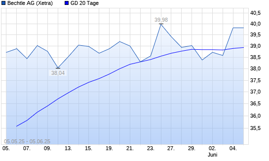 Mit dem Anstieg auf 39,66 EUR hat die Bechtle-Aktie am 04.06.2025 die 20-Tage-Linie nach oben gekreuzt.