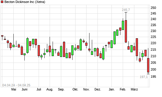 Mit dem Rücksetzer auf 202,10 EUR hat die Becton Dickinson-Aktie (ISIN US0758871091) am 03.04.2025 ein neues 3-Jahres-Tief erreicht und damit den Kurs vom 11.07.2024 eingestellt.