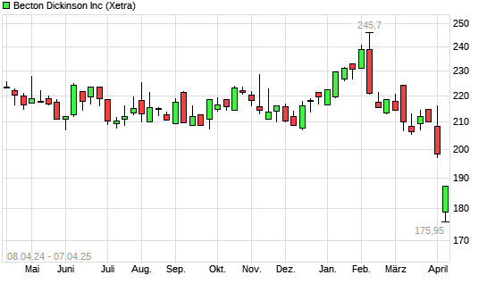Mit dem Rücksetzer auf 180,15 EUR hat die Becton Dickinson-Aktie (ISIN US0758871091) am 07.04.2025 ein neues 5-Jahres-Tief erreicht und damit den Kurs vom 24.09.2020 eingestellt.