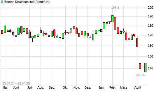 Mit dem Rücksetzer auf 171,25 EUR hat die Becton Dickinson-Aktie (ISIN US0758871091) am 22.04.2025 ein neues 5-Jahres-Tief erreicht und damit den Kurs vom 11.04.2025 eingestellt.