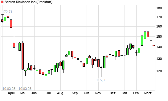 Mit dem Rücksetzer auf 140,90 EUR hat die Becton Dickinson-Aktie (ISIN US0758871091) am 09.03.2026 ein neues 5-Jahres-Tief erreicht und damit den Kurs vom 10.02.2026 eingestellt.