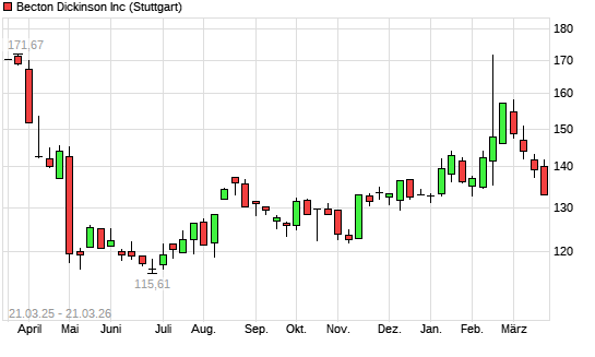 Mit dem Rücksetzer auf 135,90 EUR hat die Becton Dickinson-Aktie (ISIN US0758871091) am 20.03.2026 ein neues 5-Jahres-Tief erreicht und damit den Kurs vom 19.03.2026 eingestellt.