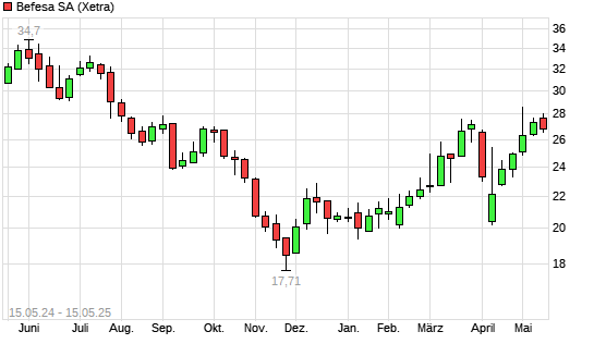 Mit dem Anstieg auf 27,48 EUR hat die Befesa-Aktie (ISIN LU1704650164) am 14.05.2025 ein neues 6-Monats-Hoch erreicht und damit den Kurs vom 27.03.2025 eingestellt.
