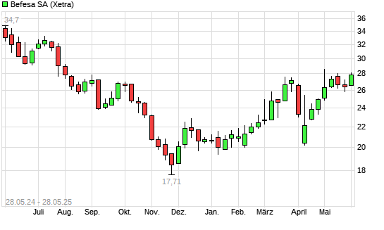 Mit dem Anstieg auf 27,68 EUR hat die Befesa-Aktie (ISIN LU1704650164) am 27.05.2025 ein neues 6-Monats-Hoch erreicht und damit den Kurs vom 14.05.2025 eingestellt.