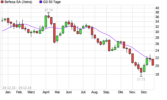 Mit dem Rücksetzer auf 21,32 EUR hat die Befesa-Aktie am 18.12.2024 die 50-Tage-Linie nach unten gekreuzt.