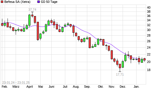 Mit dem Rücksetzer auf 20,04 EUR hat die Befesa-Aktie am 22.01.2025 die 50-Tage-Linie nach unten gekreuzt.