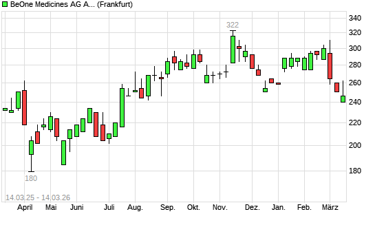 Mit dem Rücksetzer auf 246,00 EUR hat die BeiGene ADR-Aktie (ISIN US07725L1026) am 13.03.2026 ein neues 6-Monats-Tief erreicht und damit den Kurs vom 12.03.2026 eingestellt.
