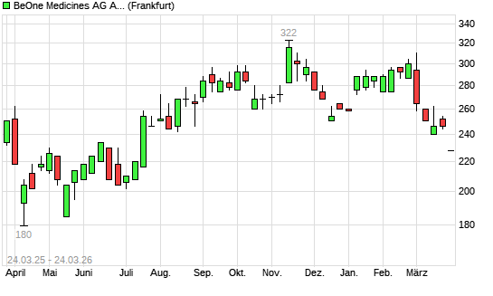 Mit dem Rücksetzer auf 228,00 EUR hat die BeiGene ADR-Aktie (ISIN US07725L1026) am 23.03.2026 ein neues 6-Monats-Tief erreicht und damit den Kurs vom 20.03.2026 eingestellt.
