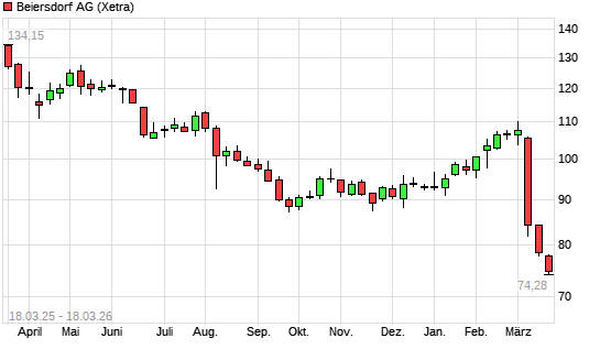 Mit dem Rücksetzer auf 74,26 EUR hat die Beiersdorf-Aktie (ISIN DE0005200000) am 17.03.2026 ein neues 10-Jahres-Tief erreicht und damit den Kurs vom 01.12.2016 eingestellt.