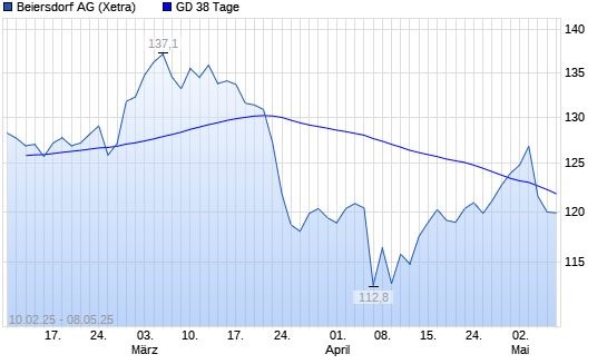 Mit dem Rücksetzer auf 120,05 EUR hat die Beiersdorf-Aktie am 07.05.2025 die 38-Tage-Linie nach unten gekreuzt.