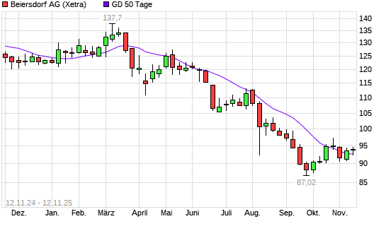 Mit dem Rücksetzer auf 92,44 EUR hat die Beiersdorf-Aktie am 11.11.2025 die 50-Tage-Linie nach unten gekreuzt.