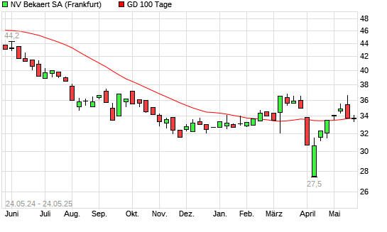 Mit dem Rücksetzer auf 33,75 EUR hat die Bekaert-Aktie am 23.05.2025 die 100-Tage-Linie nach unten gekreuzt.