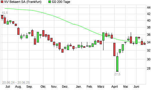 Mit dem Rücksetzer auf 33,70 EUR hat die Bekaert-Aktie am 19.06.2025 die 200-Tage-Linie nach unten gekreuzt.