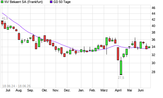 Mit dem Rücksetzer auf 33,75 EUR hat die Bekaert-Aktie am 17.06.2025 die 50-Tage-Linie nach unten gekreuzt.
