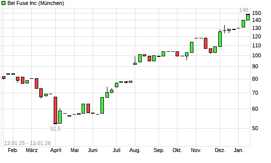 Mit dem Anstieg auf 152,00 EUR hat die Bel Fuse-Aktie (ISIN US0773472016) am 12.01.2026 ein neues All-Time-High erreicht und damit den Kurs vom 07.01.2026 eingestellt.