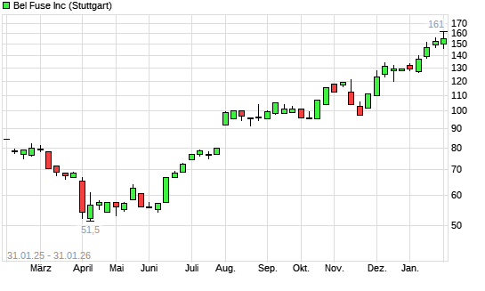 Mit dem Anstieg auf 167,00 EUR hat die Bel Fuse-Aktie (ISIN US0773472016) am 30.01.2026 ein neues All-Time-High erreicht und damit den Kurs vom 20.01.2026 eingestellt.