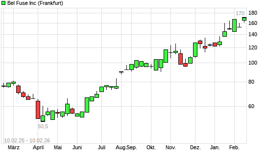 Mit dem Anstieg auf 170,00 EUR hat die Bel Fuse-Aktie (ISIN US0773472016) am 09.02.2026 ein neues All-Time-High erreicht und damit den Kurs vom 30.01.2026 eingestellt.