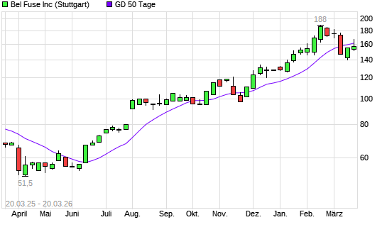 Mit dem Anstieg auf 162,00 EUR hat die Bel Fuse-Aktie am 19.03.2026 die 50-Tage-Linie nach oben gekreuzt.