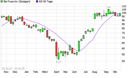 Mit dem Rücksetzer auf 90,50 EUR hat die Bel Fuse-Aktie am 14.10.2025 die 50-Tage-Linie nach unten gekreuzt.