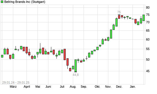 Mit dem Anstieg auf 74,00 EUR hat die BellRing Brands-Aktie (ISIN US07831C1036) am 28.01.2025 ein neues All-Time-High erreicht und damit den Kurs vom 16.12.2024 eingestellt.