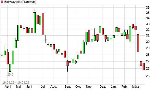 Mit dem Rücksetzer auf 25,80 EUR hat die Bellway-Aktie (ISIN GB0000904986) am 18.03.2026 ein neues 6-Monats-Tief erreicht und damit den Kurs vom 17.03.2026 eingestellt.