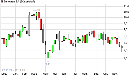 Mit dem Rücksetzer auf 7,43 EUR hat die Beneteau-Aktie (ISIN FR0000035164) am 21.11.2025 ein neues 6-Monats-Tief erreicht und damit den Kurs vom 18.11.2025 eingestellt.