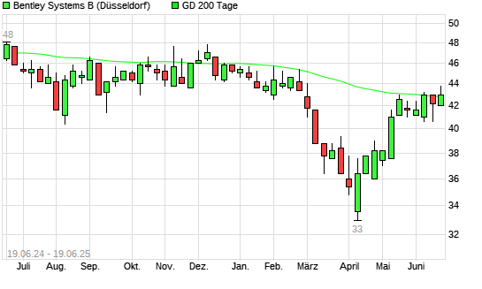 Mit dem Anstieg auf 43,20 EUR hat die Bentley Systems B-Aktie am 18.06.2025 die 200-Tage-Linie nach oben gekreuzt.