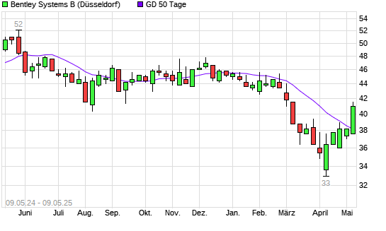 Mit dem Anstieg auf 40,60 EUR hat die Bentley Systems B-Aktie am 08.05.2025 die 50-Tage-Linie nach oben gekreuzt.