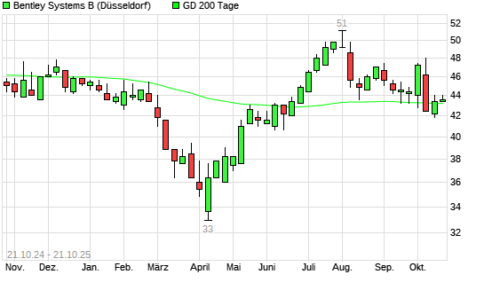 Mit dem Anstieg auf 43,60 EUR hat die Bentley Systems B-Aktie am 20.10.2025 die 200-Tage-Linie nach oben gekreuzt.Die Bentley Systems B-Aktie befand sich seit dem 13.10.2025 im langfristigen ...weiterlesen