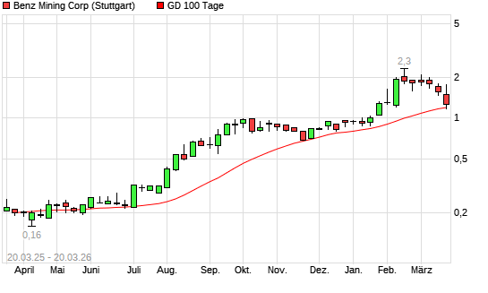 Mit dem Rücksetzer auf 1,14 EUR hat die Benz Mining-Aktie am 19.03.2026 die 100-Tage-Linie nach unten gekreuzt.