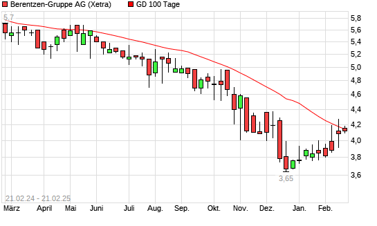 Mit dem Anstieg auf 4,15 EUR hat die Berentzen-Aktie am 20.02.2025 die 100-Tage-Linie nach oben gekreuzt.
