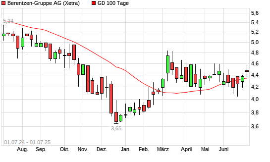 Mit dem Anstieg auf 4,54 EUR hat die Berentzen-Aktie am 30.06.2025 die 100-Tage-Linie nach oben gekreuzt.