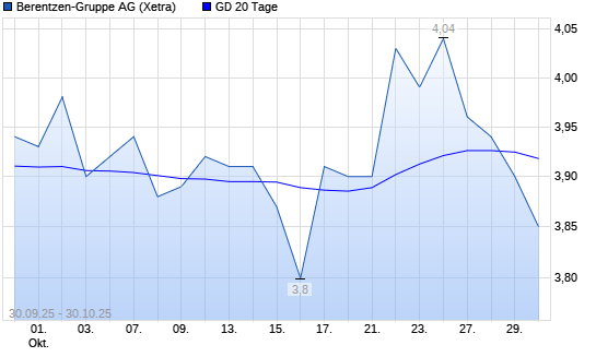 Mit dem Rücksetzer auf 3,90 EUR hat die Berentzen-Aktie am 29.10.2025 die 20-Tage-Linie nach unten gekreuzt.