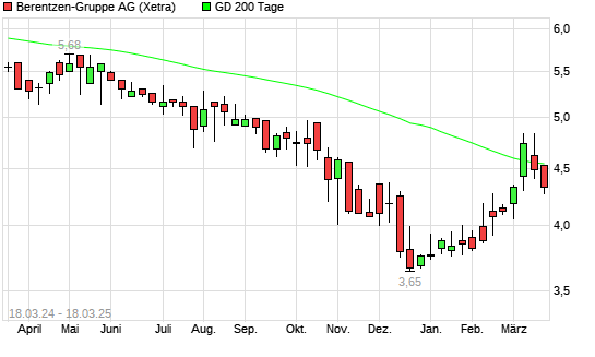 Mit dem Rücksetzer auf 4,46 EUR hat die Berentzen-Aktie am 17.03.2025 die 200-Tage-Linie nach unten gekreuzt.