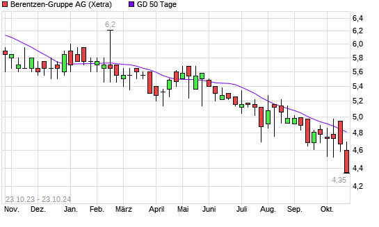Mit dem Rücksetzer auf 4,60 EUR hat die Berentzen-Aktie am 22.10.2024 die 50-Tage-Linie nach unten gekreuzt.