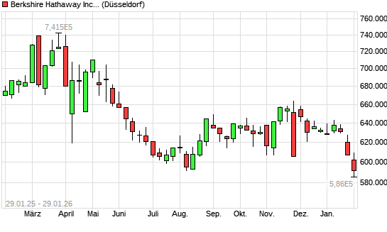 Mit dem Rücksetzer auf 584.500,00 EUR hat die Berkshire Hathaway A-Aktie (ISIN US0846701086) am 28.01.2026 ein neues 12-Monats-Tief erreicht und damit den Kurs vom 04.08.2025 eingestellt.
