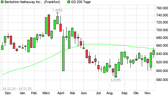 Mit dem Anstieg auf 654.500,00 EUR hat die Berkshire Hathaway A-Aktie am 13.11.2025 die 200-Tage-Linie nach oben gekreuzt.