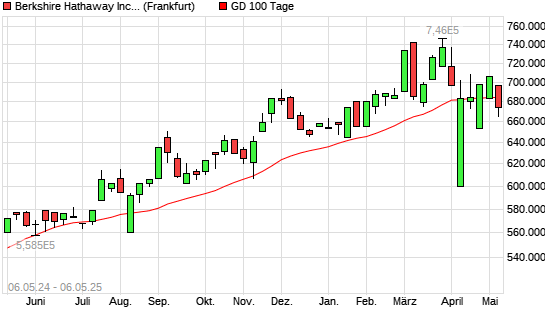 Mit dem Rücksetzer auf 671.500,00 EUR hat die Berkshire Hathaway A-Aktie am 05.05.2025 die 100-Tage-Linie nach unten gekreuzt.