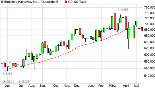 Mit dem Rücksetzer auf 679.500,00 EUR hat die Berkshire Hathaway A-Aktie am 14.05.2025 die 100-Tage-Linie nach unten gekreuzt.