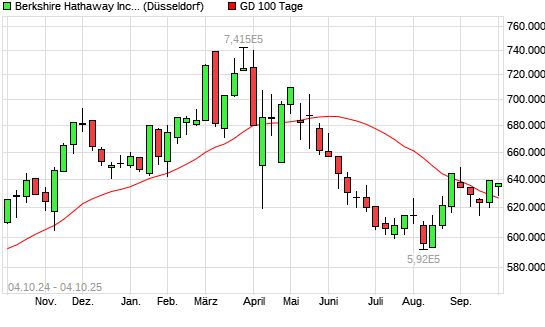 Mit dem Rücksetzer auf 624.000,00 EUR hat die Berkshire Hathaway A-Aktie am 03.10.2025 die 100-Tage-Linie nach unten gekreuzt.