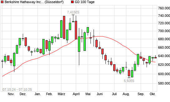 Mit dem Anstieg auf 640.500,00 EUR hat die Berkshire Hathaway A-Aktie am 06.10.2025 die 100-Tage-Linie nach oben gekreuzt.Die Berkshire Hathaway A-Aktie befindet sich seit dem 29.05.2025 im ...weiterlesen