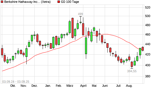 Mit dem Rücksetzer auf 428,95 EUR hat die Berkshire Hathaway B-Aktie am 02.09.2025 die 100-Tage-Linie nach unten gekreuzt.