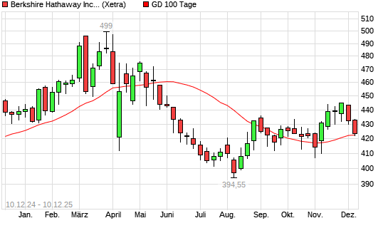 Mit dem Rücksetzer auf 422,55 EUR hat die Berkshire Hathaway B-Aktie am 09.12.2025 die 100-Tage-Linie nach unten gekreuzt.