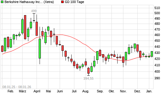 Mit dem Rücksetzer auf 423,15 EUR hat die Berkshire Hathaway B-Aktie am 07.01.2026 die 100-Tage-Linie nach unten gekreuzt.