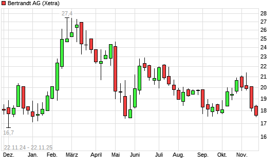 Mit dem Rücksetzer auf 17,12 EUR hat die Bertrandt-Aktie (ISIN DE0005232805) am 21.11.2025 ein neues 6-Monats-Tief erreicht und damit den Kurs vom 26.09.2025 eingestellt.