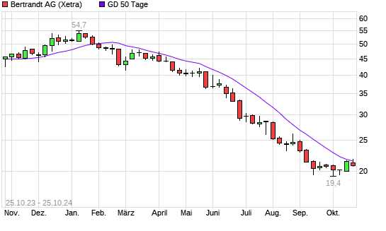 Mit dem Rücksetzer auf 21,50 EUR hat die Bertrandt-Aktie am 24.10.2024 die 50-Tage-Linie nach unten gekreuzt.