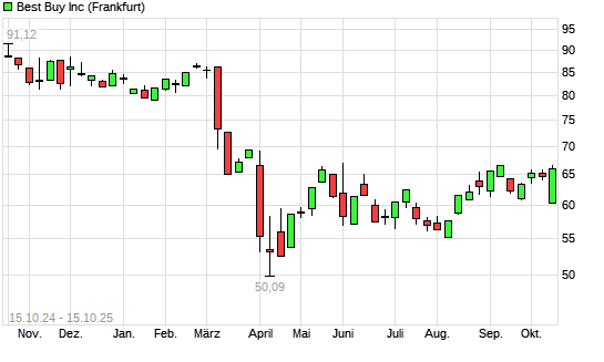 Mit dem Anstieg auf 66,67 EUR hat die Best Buy-Aktie (ISIN US0865161014) am 14.10.2025 ein neues 6-Monats-Hoch erreicht und damit den Kurs vom 12.09.2025 eingestellt.