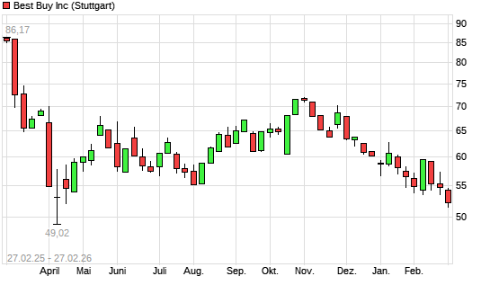 Mit dem Rücksetzer auf 52,22 EUR hat die Best Buy-Aktie (ISIN US0865161014) am 26.02.2026 ein neues 6-Monats-Tief erreicht und damit den Kurs vom 23.02.2026 eingestellt.